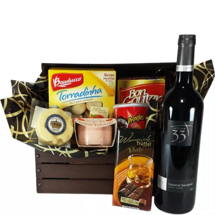 Baú de madeira contendo produtos de extremo bom gosto para presentear com elegância: