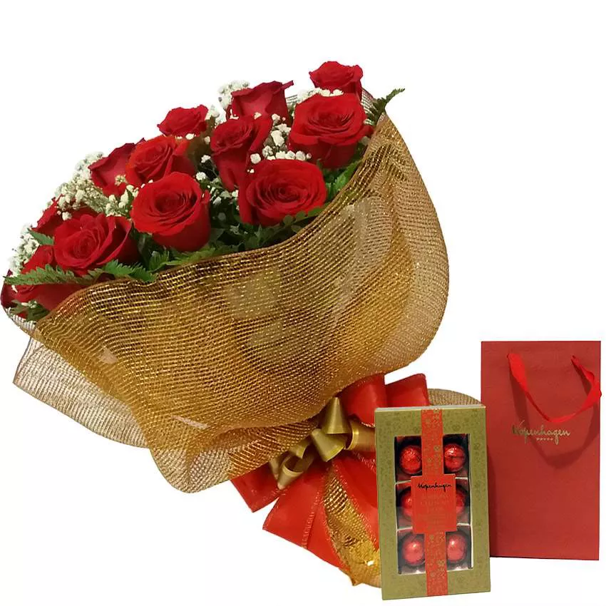 Surpreenda com esse lindo e glamouroso buquê superior!! São 15 lindas rosas importadas vermelhas com folhagens finamente embalado em tela decorativa. Para completar ainda mais a surpresa, uma caixa de presente contendo os famosos bombons de cereja Kopenhagen Envie flores e surpreenda!! |