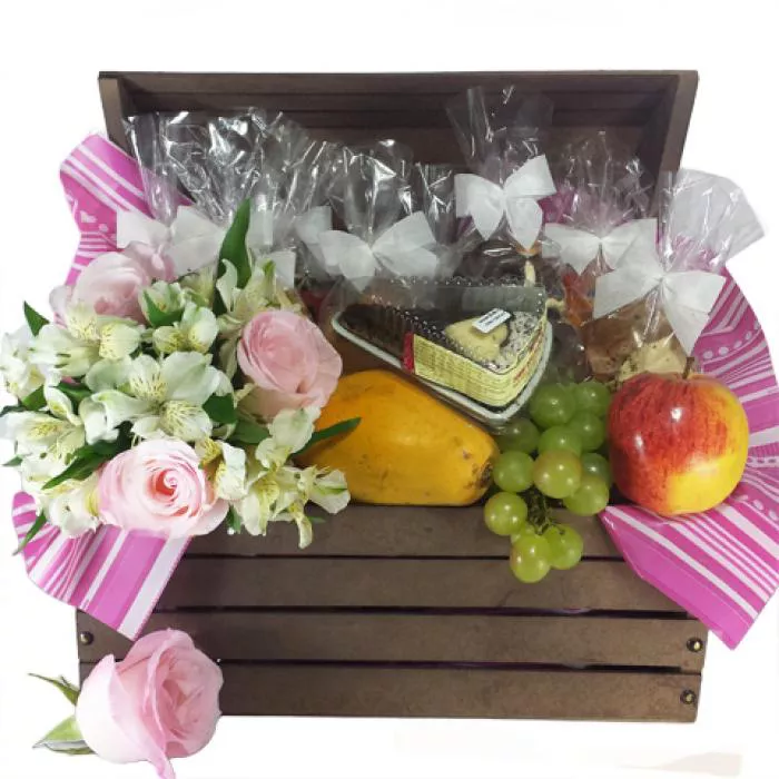 Delicioso café da manhã em baú de mdf sofisticado para agradar alguém especial juntamente com mini buquê de flores: