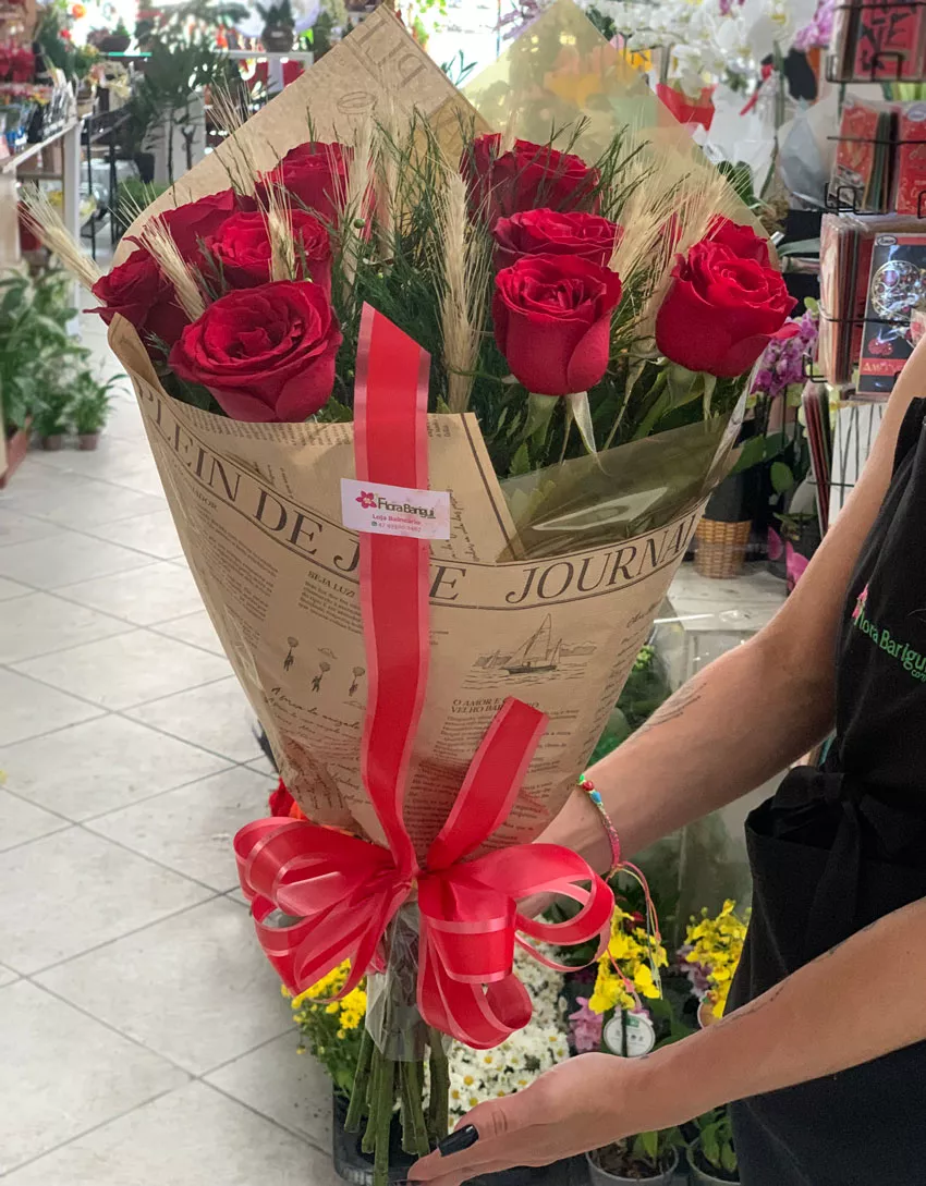 Envoltas em jornal estilo frances são 12 lindas rosas colombianas, com ramos de trigo para simbolizar a riqueza do amor…