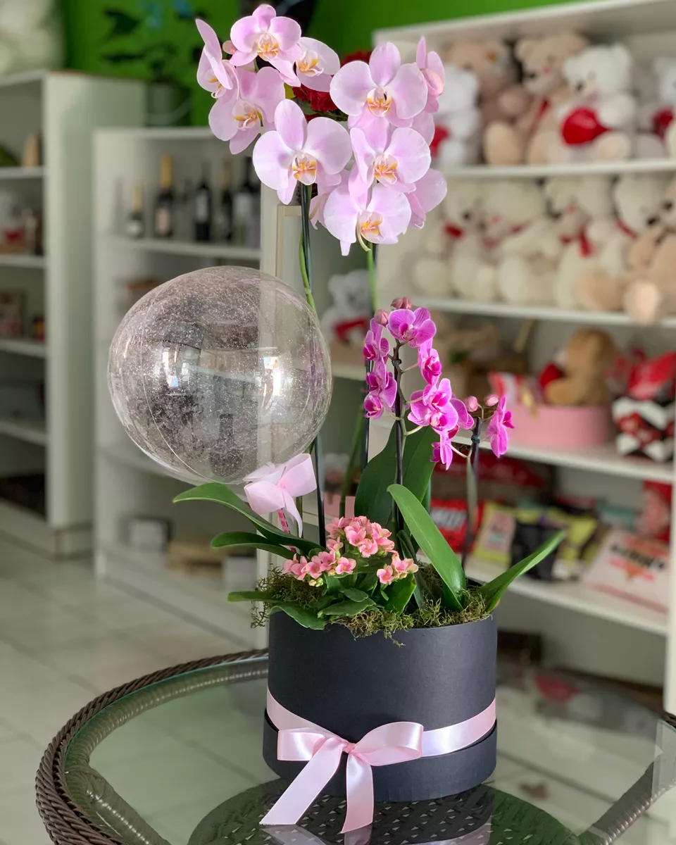 Belíssima orquídea phalaenopsis decorada com laços para presente em cachepot com um Bubble para surpreender em qualquer ocasião.